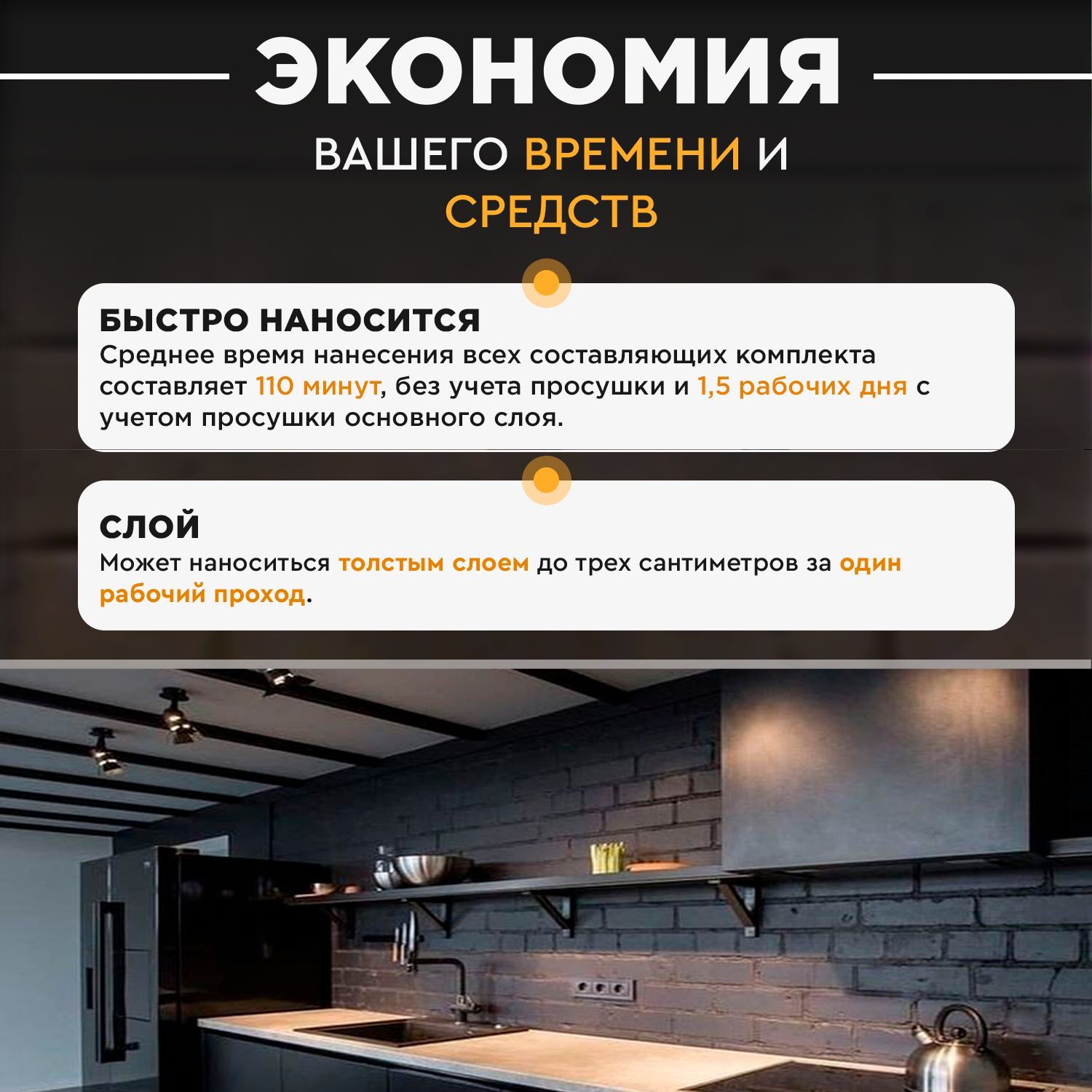 - Быстро наносится. Среднее время нанесения всех составляющих комплекта около 110 минут, без учета просушки и 1,5 рабочих дня с учетом просушки основного слоя.