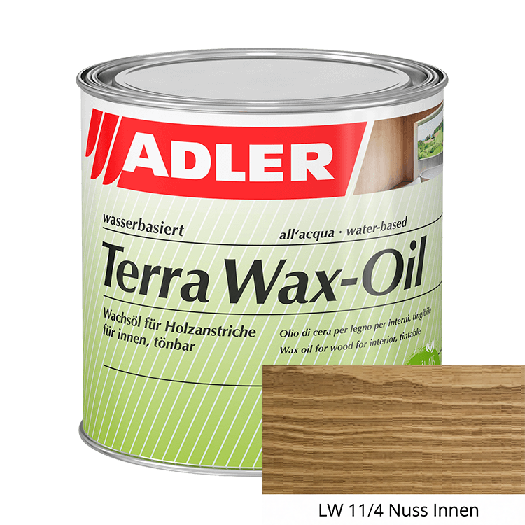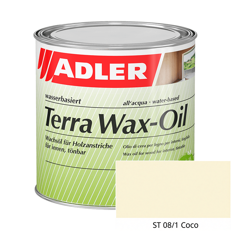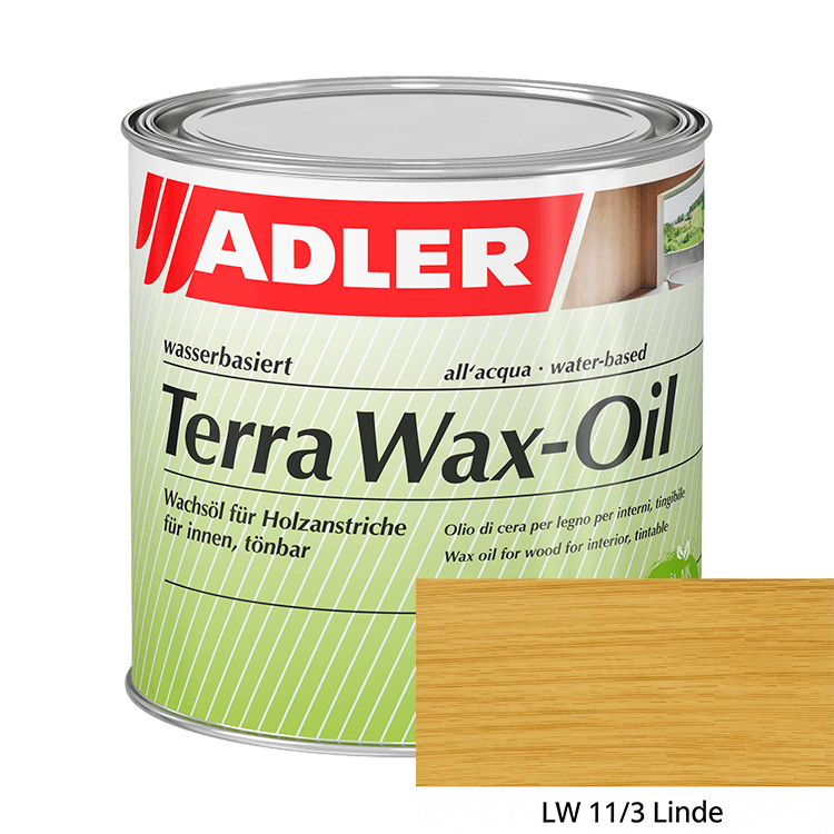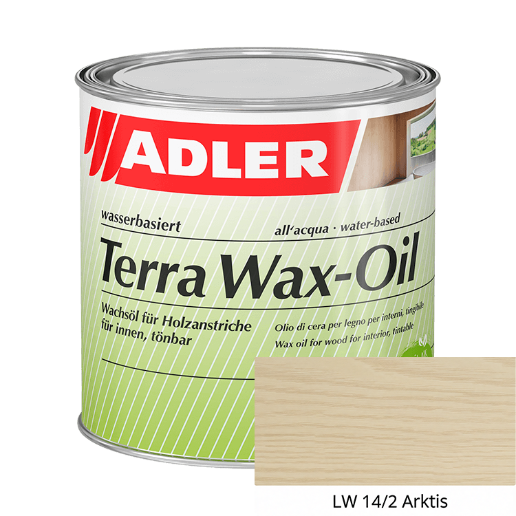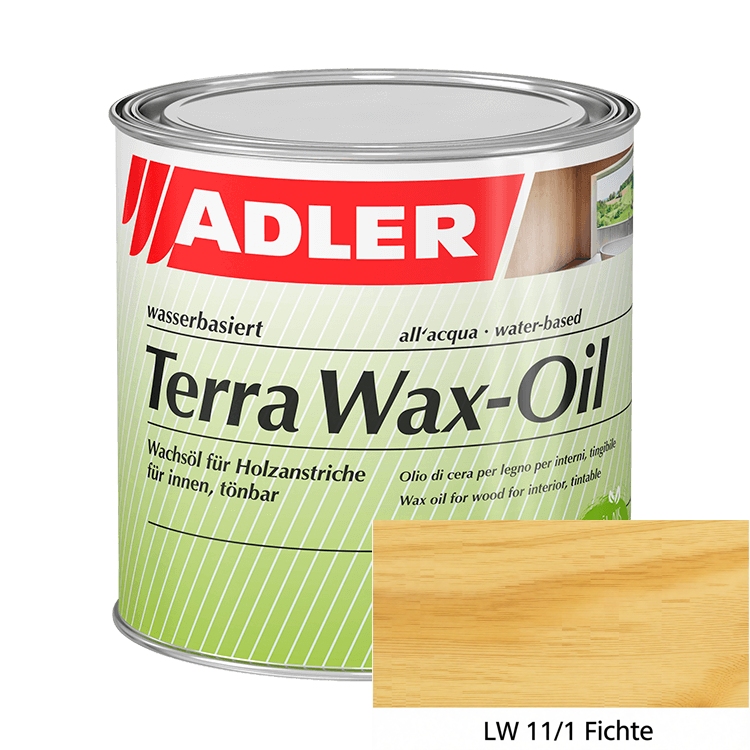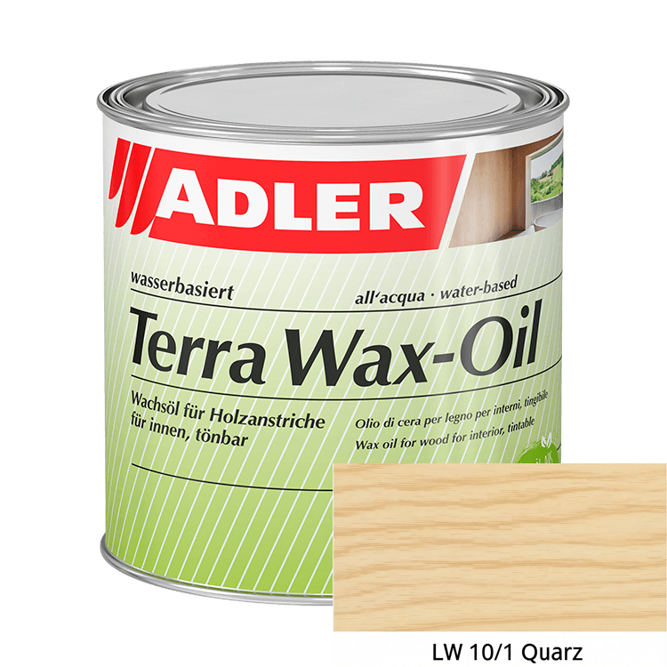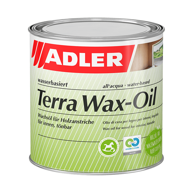 масло для дерева внутри помещения, экологичное масло для дерева, масло с воском на водной основе, безопасное покрытие для дерева, масло для стен из дерева, масло для хвойных пород, без запаха, без ЛОС, для детской комнаты, ADLER Terra Wax-Oil, австрийское масло для дерева, Cradle to Cradle, французская маркировка A+, колеруемое масло для дерева.