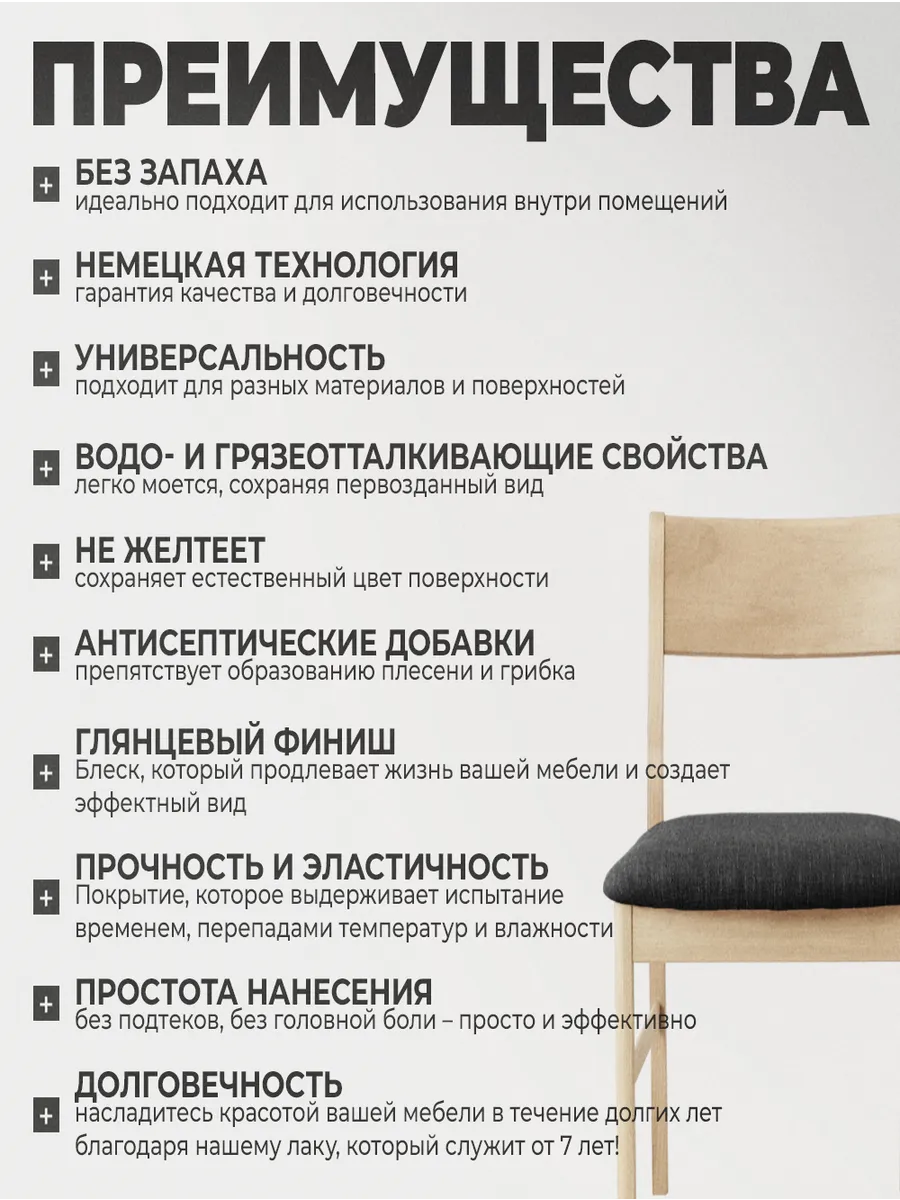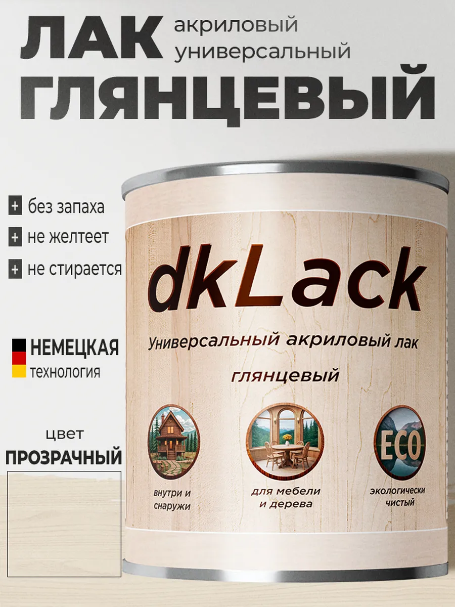 Универсальный акриловый лак dkLack - это превосходный инструмент для защиты и декорирования мебели, дерева и других материалов, включая камень и гипс. Преимущества нашего лака неоспоримы: он без запаха и абсолютно прозрачный! Основой лака является уникальная комбинация акриловых сополимеров на водной основе, которая обеспечивает легкость нанесения и безопасность использования внутри помещений. Благодаря своей износостойкости, это идеальный лак для деревянной мебели, который выдержит физический износ и сохранит первозданный вид. Еще одним преимуществом является его способность создавать эластичное покрытие, устойчивое к перепадам влажности и температуры, что делает поверхность, обработанную нашим лаком, водо- и грязеотталкивающей. Наш акриловый глянцевый лак обеспечивает идеальный глянцевый блеск, который продлевает жизнь вашей мебели и создает эффектный вид.