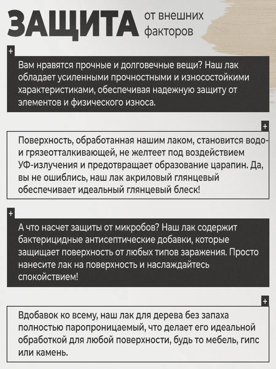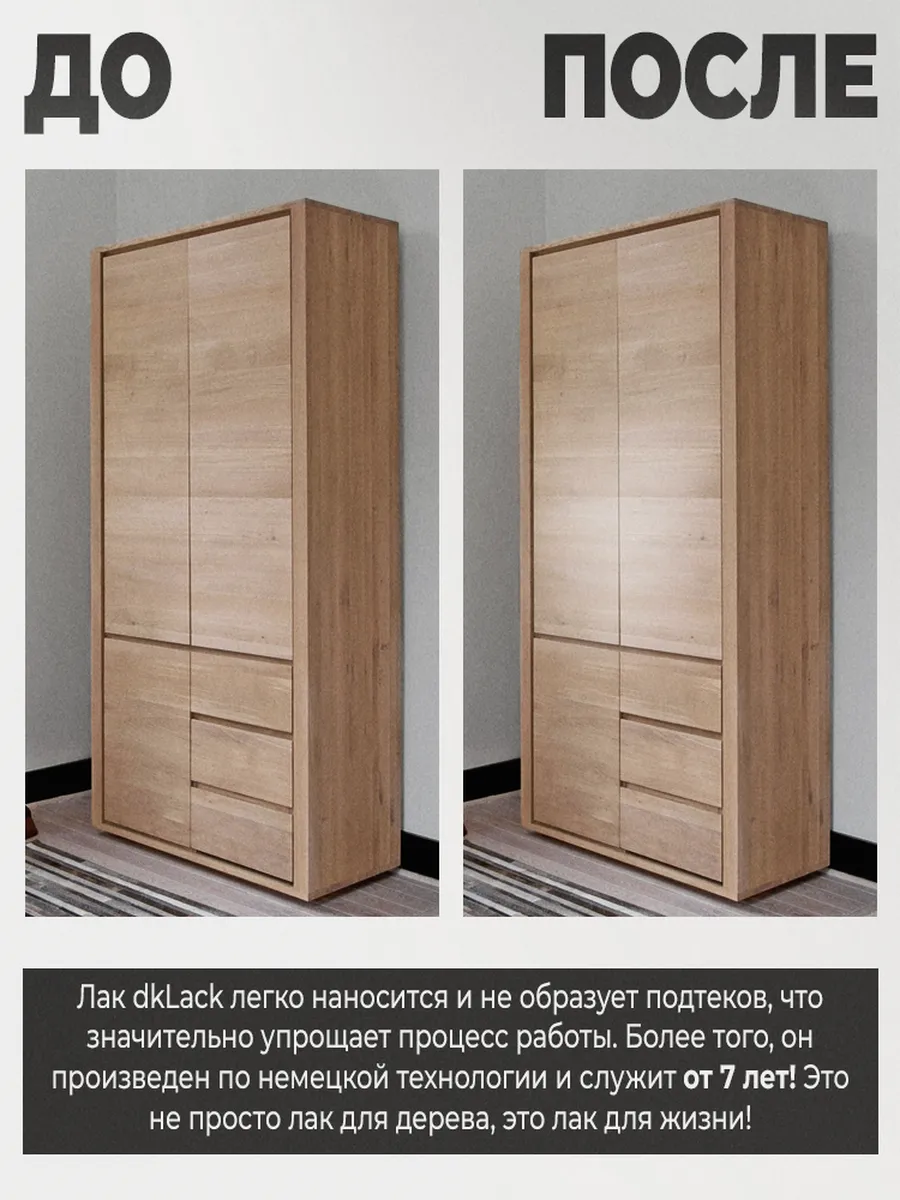Благодаря паропроницаемости, наш лак идеально подходит для обработки любых поверхностей, будь то дерево, гипс или камень. Он служит от 7 лет! Это не просто лак для дерева, это лак для жизни! Наш акриловый глянцевый лак dkLack - это универсальное решение для защиты и декорирования вашей мебели. Откройте для себя новые возможности с нашим продуктом!